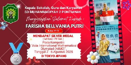 Alhamdulillah, tabarakallah, Allah Swt kembali melimpahkan nikmat-Nya kepada keluarga besar SD Muhammadiyah 2 Pontianak dengan raihan prestasi di tingkat internasional, yaitu dengan keberhasilan Farisha Bellvania Putri (kelas VI CI) meraih medali perak (silver medal) pada kompetisi "Asia International Mathematical Olympiad (AIMO)" 2025 di Tokyo, Jepang pada tan...
